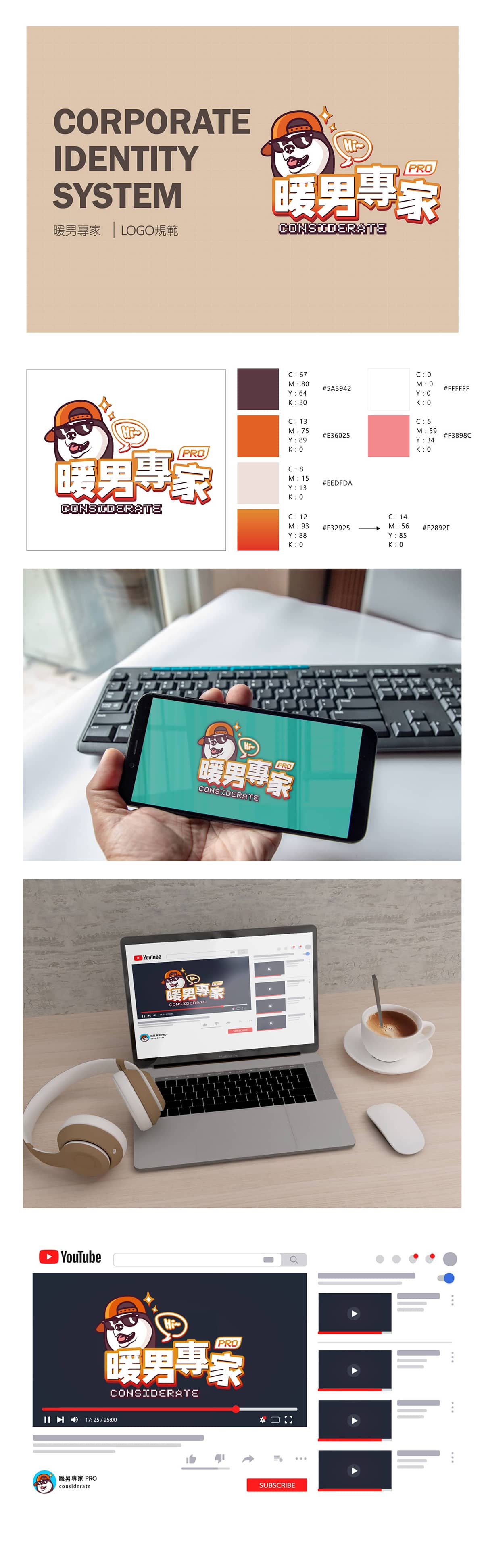 暖男專家以經營Youtube平台為主,希望logo可以帶出幽默風趣、貼近人群的形象,在logo設計上與團隊經過多次溝通後,決定以哈士奇為主角既可帥也可萌,搭配橘色系的暖色調配色,希望表現出充滿活力與幽默風趣的氛圍。